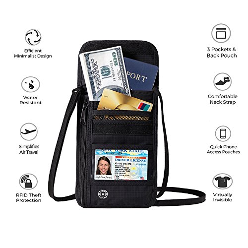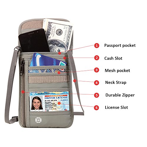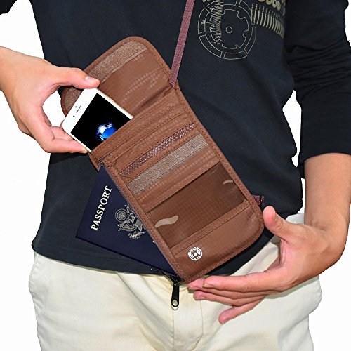 VARIOUS FUNCTIONAL SLOTS -- 1 passport pocket (max fit 2-3 passports), 3 card slots, 1 cellphone pouch, 1 money coins zippered pocket (fit U.S. money).