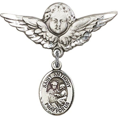 -. Title : Sterling Silver Baby Badge with St. Anthony of Padua Charm and Angel w/Wings Badge Pin 1 1/8 X 1 1/8 inches