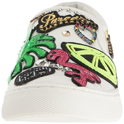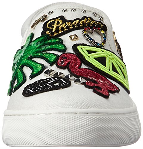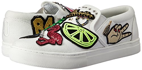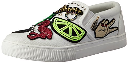 Product DescriptionCanvas slip on sneakers have many playful patches and jewelry charms0