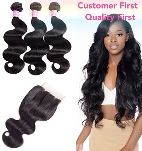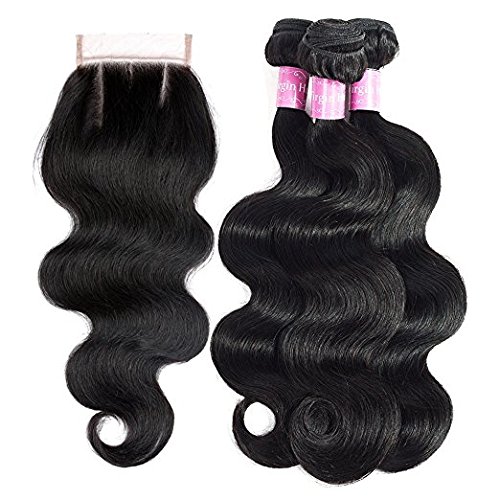 10A Brazilian Body Wave100%Human Hair With Closure 3 Bundles With Three Part Closure(14 16 18+12 Three part closure) Natural Black Human Hair...