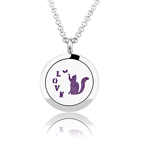 INFUSEU Aromatherapy Essential Oil Diffuser Necklace Stainless Steel Locket Pendant with 28" Long Chain & 12PCS Refill Pads for Cat Lovers Meaningful Scent Jewelry Gifts