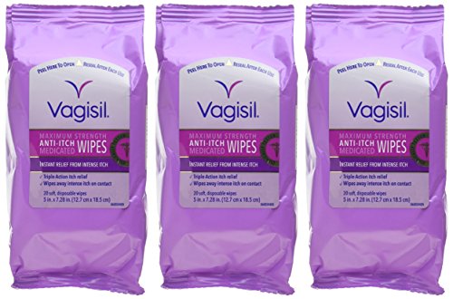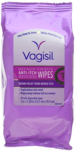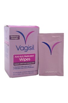Studio : Vagisil Publisher : Vagisil Binding : Health and Beauty Product Description Feel Comfortable with Wipes Feminine itching can be uncomfortable. Vagisil Medicated Anti-Itch Wipes are great to give relief from feminine itching. These anti-itch wipes contain a maximum strength itch medicine in a soft and convenient to use wipe. Plus, they contain soothing Vitamins E, A and D that can give a smooth and soft skin. When you have a painful, burning itch you need relief fast - no matter where you are. No wonder more women trust Vagisil Anti-Itch Medicated Wipes to relieve intense itch instantly. And for added confidence they contain patented Odor Block Protection to help keep odor from happening. Convenient and discreet, they're the perfect way to feel confident whether you're at home or out and about. Vagisil Medicated Anti-Itch Wipes are convenient to carry and can relieve the intense burning itching quickly leaving you feel comfortable. 12 individually wrapped wipes. Keep one in your bag for whenever you need it. Just For You: Adults and children 12 years and over A Closer Look: Medicated Anti-Itch Wipes are made to give relief from intense burning and itching instantly. These wipes are made with odor blocking technology that can easily wipe out the discharge and block the odor. One side of the Anti-itch wipe cleanses while the other gives relief from itching and discharge. These contain vitamins that can leave the skin soft and smooth. These wipes are individually packed and are easy to use. Get Started: Unfold the wipe and gently pat or wipe the vaginal area from front to back. 0
