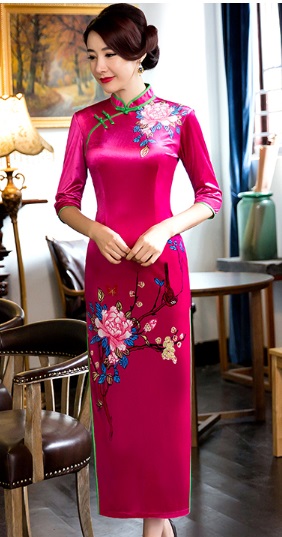 花柄 タイト ロング ハイネック 七分丈 チャイナドレス