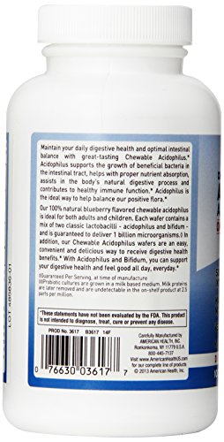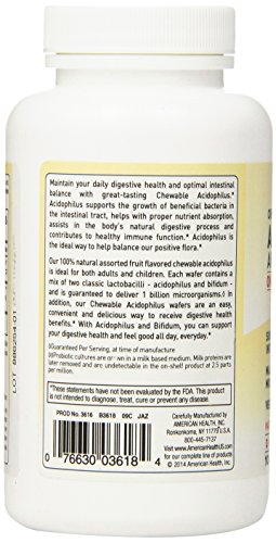 -. Binding : Health and Beauty -. Brand : American Health -. IsAdultProduct : 0 -. Label : AMERICAN HEALTH -. Manufacturer : AMERICAN HEALTH -. PackageQuantity : 1 -. ProductGroup : Health and Beauty -. ProductTypeName : HEALTH_PERSONAL_CARE -. Publisher : AMERICAN HEALTH -. Studio : AMERICAN HEALTH -. Title : American Health - Acidophilus Chewable With Bifidus