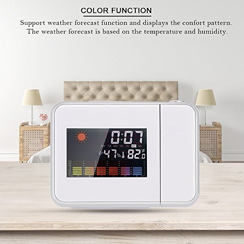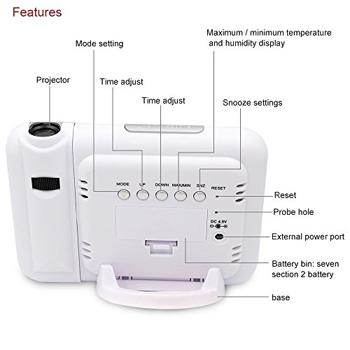 Studio : Aphaca Direct Publisher : Aphaca Direct Binding : Kitchen Product Description This projection clock can manual 180-degree swivel projection has a full color screen that displays time, temp, humidity and projects the time onto any wall or ceiling,it also has alarm/snooze function. 1.Calendar Range: 2000-2099 2.Temperature Range: -10 ~ 61C ( 14.2 ~ 140F ) 3.Humidity Range: 20%~99% 4.12-hour temperature trend curve 5.Four-level weather forecast: sunny, half-sunny, cloudy, rainy 6.Query the history of MAX and MIN, update the temperature and humidity automatically. 7.Projection distance: about 1-5 meters 8.Font height: about 20-60cm 9.Projection rotation angle: 180 degrees 10Product size: high is 11cm ,wide is 15cm. Product Power: A program (with 3 AAA batteries) The projector screen will disappear after 8 seconds(Power saving settings), if you want to see the time and then click on the top of the "LIGHT" button. B program (with USB charging cable ) AC transformer power supply, the projection and the screen is always bright (no close function), you can see LED backlight and projection all the time. Note:The alarm needs to be reset the time after power outage, 12 Hour and 24 Hours can switch display. Package List: 1x Projection Clock 1x USB Charging Cable 1x Instructions Note: Open alarm clock function, please have a try to press UP button. If you have any problems about the clock or setting, please do not hesitate to contact us.