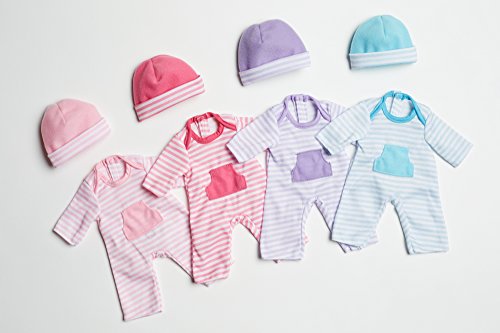 Dressed and ready to play! Our Striped Hot Pink Romper is perfect for most dolls 9" to 11". Quality outfits are machine washable and made to last thru all those diaper changes! Rompers are available in 4 fashionable colors for you to choose from so you can have the best dressed baby doll in the playground. Clothes securely fasten in the back with hook and loop, perfect for little fingers. Sweet little pocket details and matching hat make this outfit extra cute. JC Toys rompers are safe for all dolly mommies and daddies 2+. JC Toys meets and exceeds all Toy Safety Requirements.Feature