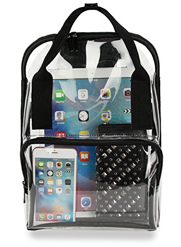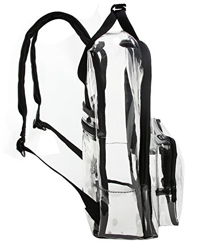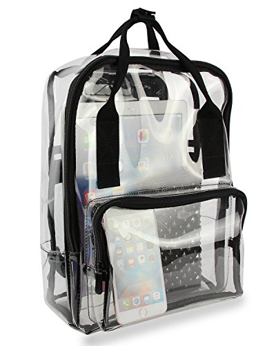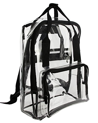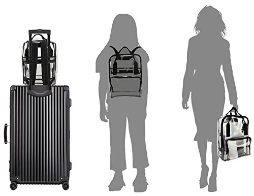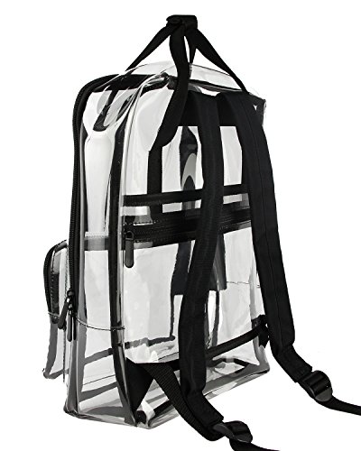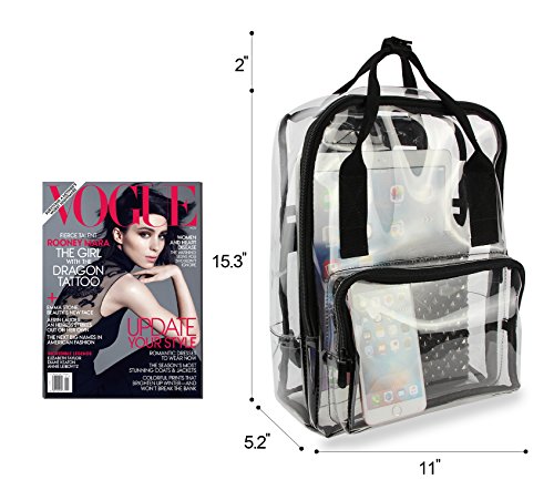 -. Feature : Material: PVC; Size: 11 X 14.2 X 5.2 (Inches) , Top handle (H): 2 inch / Suitable for concerts, casinos, retail, examination room and other workplace where clear bag are required / Structure: One large main zipper compartment, One front zipper pocket, One back zipper pocket / Features: see through material for quick, easy identification of contents; Pass security checks easily; Smooth zipper closure / The clear backpack can be fixed on the draw-bar box; Adjustable padded back-straps for carrying comfort; Top double handles for a secure hold when picking up or moving the backpack.