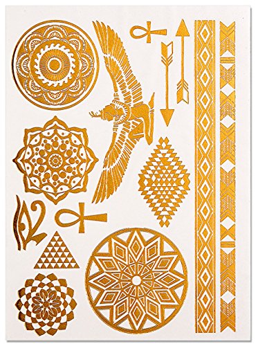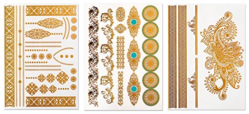 -. Feature : This set of Metallic temporary tattoos for women not only look fabulous with a dinner dress but are perfect for the beach, festivals, parties, concerts and more. / 9 Different sheets, 100+ designs, super Shimmery, including necklaces, bracelets, feathers, tribal, chevrons, henna designs, arrows, and many more. / Completely Waterproof, long lasting. 100% Non-Toxic, be safe to use. Easy to apply and remove.celets, feathers, tribal, chevrons, henna designs, arrows, and many more. / These temporary tattoos has sizes for All over your body, Fit from fingers to back. / Tattoos will last for 3-5 days if properly care for, avoiding contact with oil based products. Not intended for children under 6 years. Do not apply to sensitive skin, near eyes, of if allergic to adhesive.