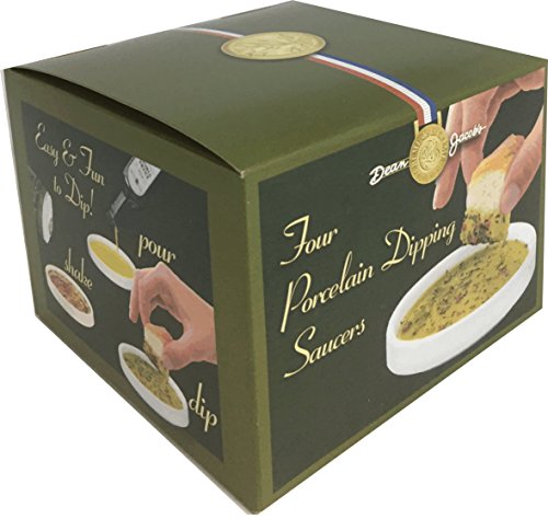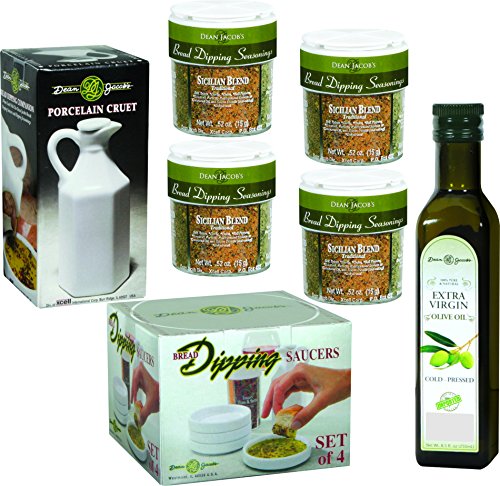 -. Feature : This Dean Jacob's Bread Dipping Set includes: / Set of 4, 3½" round, white, porcelain dipping saucers in NEW decorative box / Bottle of Cold-Pressed Extra Virgin Olive Oil from Italy, Greece & Spain. Imported from Italy. 8.5 fl.oz. (Kosher) / 4 - Small, Personal Size, 4in1 Compartment Jars with .60 oz. each of Dean Jacob's Bread Dipping Seasonings: / ♥ Parmesan Blend with Roasted Garlic & Cheese ♥ Traditional Sicilian Blend ♥ Rosa Maria with Rosemary & Garlic ♥ Tuscany Blend with Sun-dried Tomato & Basil