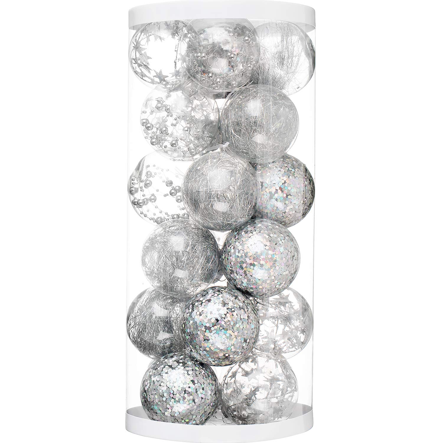 【パッケージ内容】ボール装飾品24個セット 【本体サイズと素材】(約):直径8cm 素材:プラスチック 【カラーと図柄】4柄×各6個 (ひも付き)カラー:透明ボール,ボール内部にシルバー飾り 【商品の梱包】配送により破损を防ぐため、改善した包装は以前より10倍の厚さでもっと丈夫で輸送トラブルを减らできます。また缲り返し利用もできます。外侧の包装に「Open Here」と字で目立つように书かれていた。 【聖なる夜を楽しむ】高級感のある透明タイプ、より一層華やかにしてくれるオーナメントボールです!。好きな色を組みあわせて、可愛らしいデザインが楽しい雰囲気を演出し、クリスマスを一層華やかにします。