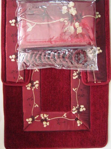 4 Piece Luxury Embroidered Bath Rug Set/ 3 Piece Burgundy Bathroom Rugs with Fabric Shower Curtain and Matching Rings