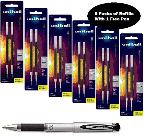 6 packs 65808 UniBall Signo Impact 207 Black gel ink 1.0 mm refills (12 Refills Total) plus 1 Free 65800 Black Gel Ink Pen