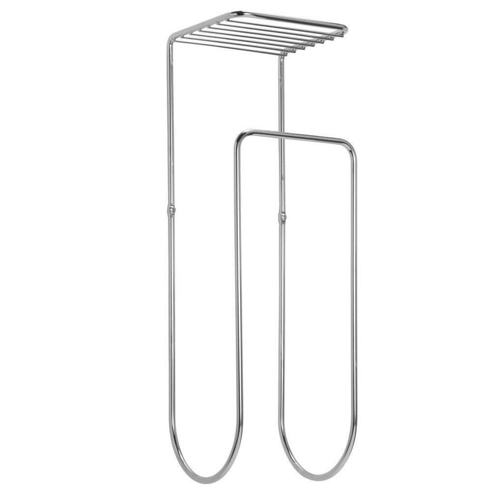 It is made of steel, has a chrome finish, and features a curved arm and top shelf that are effective for storing towels and towels.