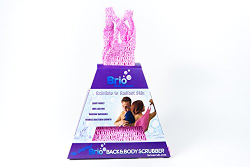 The Brio Back and Body Scrubber's patented, hand crocheted, innovative design provides vigorous exfoliation to reveal younger, radiant skin in even the hardest-to-reach areas. Rather than a long narrow piece of material, the Brio Back and Body Scrubber was designed to be wider in the middle. The diamond shape prevents it from twisting and provides better coverage across your back. Simply use your favorite bar of soap in the built-in soap pocket or use body wash while showering or bathing to create a lather and immediately feel the benefit of exfoliation. The design and material also make it bacteria resistant in addition to delivering intense exfoliation. What good is a bath poof, wash cloth, loofah or body brush if it harbors bacteria, mold or fungus? The Brio Back and Body Scrubber is hand-crocheted using a nonporous polyurethane material that dries between uses making it more hygienic than other commonly used shower products. This material also gives the Brio the perfect texture for vigorous body exfoliation to remove dead skin cells. Exfoliation helps fight back and body acne and improves dry skin. The Brio is also a favorite tool of hard-working folks to thoroughly clean their hands after a long day's work. The first few times you use your Brio, you may be pleasantly surprised at how deeply it cleans. Please note that that due to the Brio's exfoliating properties, it may not be suitable for sensitive skin. Do not use the Brio on irritated, damaged or broken skin. Care Instructions: The Brio Back and Body Scrubber is machine washable. Please wash before first use. Every couple of weeks just toss it into the washing machine with a load of laundry and hang to air dry. Brio Body Products is an American Veteran owned company. We donate up to 5% of our profits to First Responder's and Veteran's Organizations.Feature