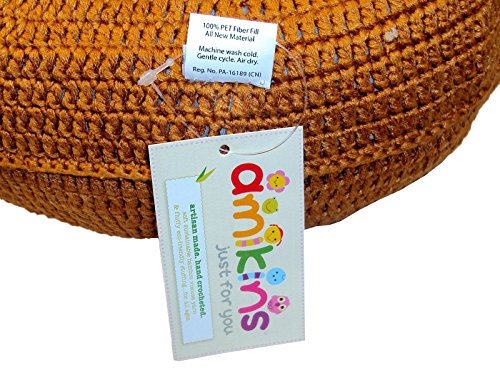 Product Description So soft...so cuddly...so charming! This cute and collectible AmikinsTM KidStyle crocheted throw pillow is handmade using the techniques of the Japanese art of Amigurimi (pronounced ah-mee-goo-roo-mee). Pillow is carefully hand crocheted by a single artisan using vividly colored yarns, and is sure to become a precious pal for all ages. The yarn is a super-soft sustainable and organic bamboo viscose yarn (100% rayon from bamboo), and the equally soft and eco-friendly stuffing is spun from recycled soda bottles. These eco-friendly products meet CPSIA safety requirements. Caring for your Amikins pillow is easy, too. Simply spot-clean any lightly soiled areas, or place it in a lingerie bag for a trip through the washing machine on the gentle cycle with cold water. Overall dimensions of the pillows are approximately 11.5" diameter and 4" thick. 0