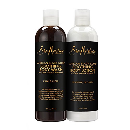 Shea Moisture Calm Clear and Heal Set of African Black Soap Body Wash and Lotion. Features 1 (13 Fluid Ounce) African Black Soap Body Wash and 1 (13 Fluid Ounce) African Black Soap Body Lotion. With Oats, Aloe and Vitamin E to Soothe, Protect, and Moisturize Skin. Made in the USA - Sulfate Free, Paraben Free, Phthalates Free, Cruelty Free - Certified Organic Ingredients. A Balanced Blend of African Black Soap and Shea Butter. Moisturizing, Calming, and Healing African Black Soap Shower Set.Feature