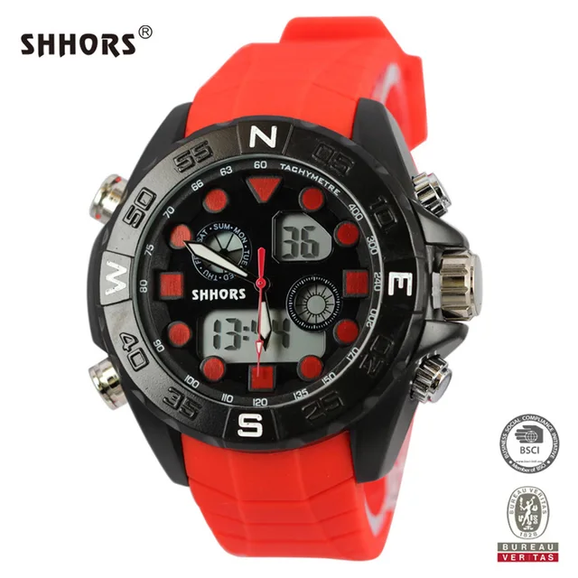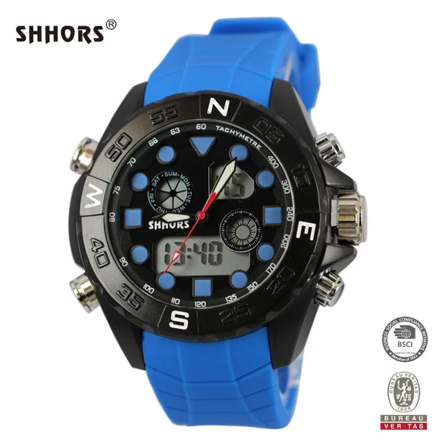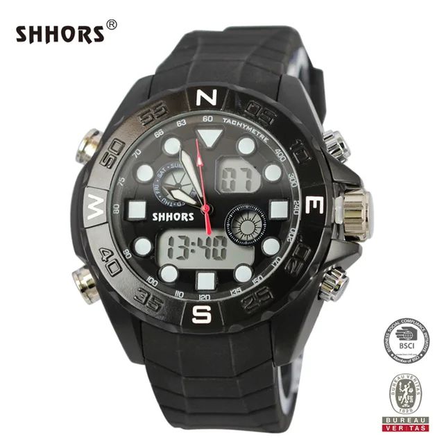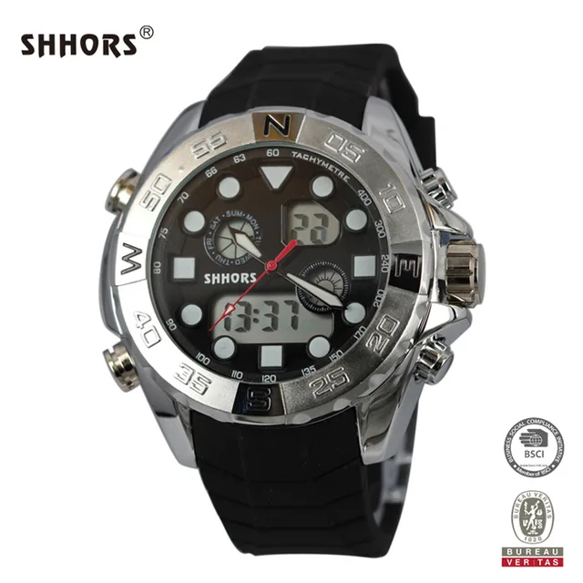 | [해외] Shhors 시계 남성 성격 다기능 듀얼 타임 시계 합금 케이스 전자 손목 시계 구리 푸셔 zegarki |
