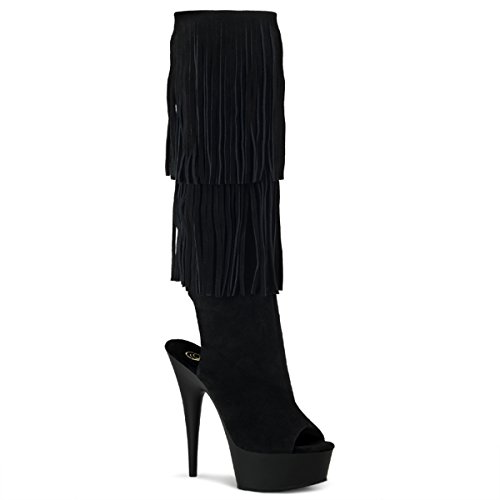 Product DescriptionHeel Height: Approx. 6' Tall. Open toe/back fringed knee boot. Full inner side zipper.0