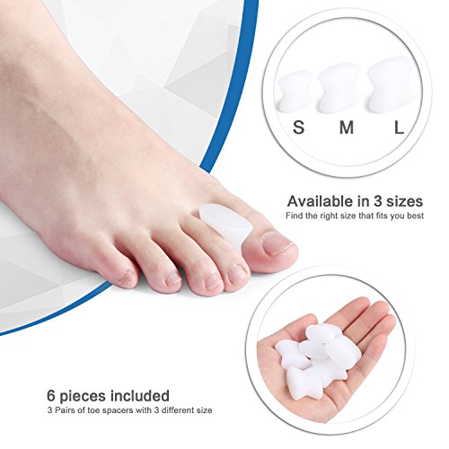 MONEY BACK GUARANTEE: Set of 6 pieces 3 size toe separator for toes pain relief. If you don't like it for any reason, you can just take advantage of our 30 days warranty. We will replace it or give your money back for any reason