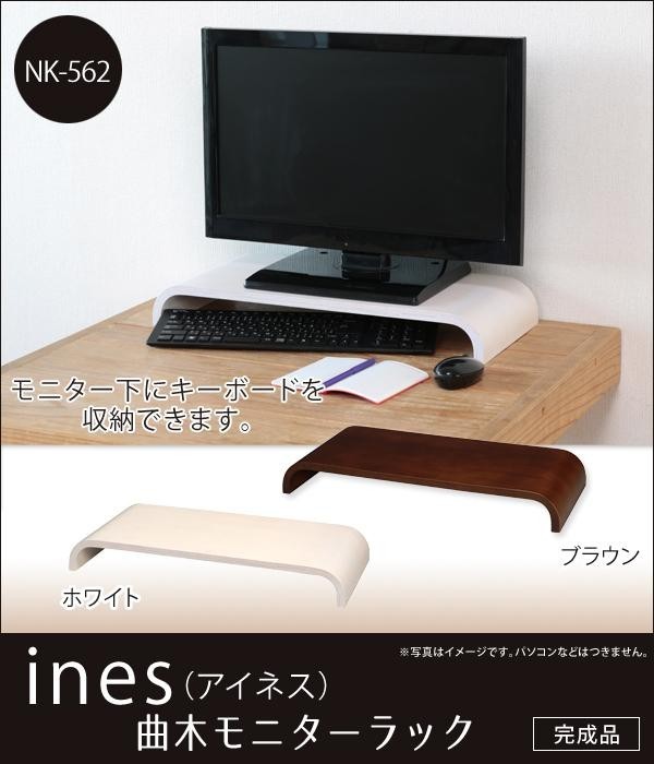 滑らかな曲線と温かみのある木目のパソコンラック。 モニター下に空間を作ることにより、キーボードを収納して作業スペースが広くとれます。キーボードを使わない時はラックの下に収納できます。 |