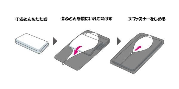 | 従来タイプは三方ファスナー式だったので布団の出し入れに場所を取り、非常に面倒な作業が必要でした。センターファスナー式なので、布団を3つ折りにして入れ、中で伸ばすだけなので場所を取らず簡単に作業できます。本体生地にはポリエステルタフタを使用しているので洗濯機で洗えます。 |