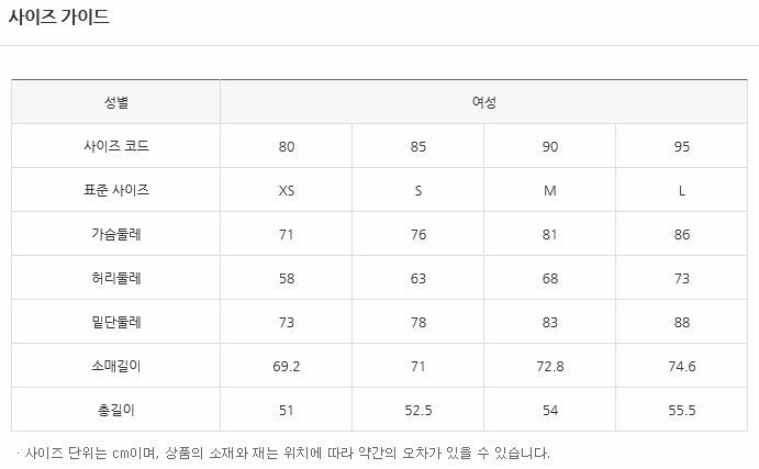 | 치수 | 실측(90)사이즈(cm)-가슴둘레76 소매길이74 총장55 |