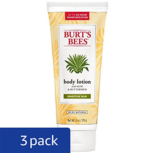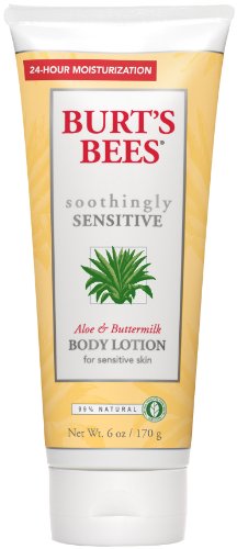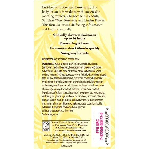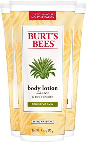 Embrace your sensitive side with hypoallergenic, dermatologist-tested Burt's Bees Aloe and Buttermilk Body Lotion. Clinically shown to moisturize for up to 24 hours, this non-greasy lotion replenishes your beautiful skin with some serious moisture. Enriched with aloe and buttermilk to quickly nourish skin and enhanced with natural extracts, Chamomile, Calendula, St. John's Wort, Rosemary and Linden Flower to gently sooth it. Make your skin feel soft, smooth and healthy, naturally everyday with Burt's Bees.