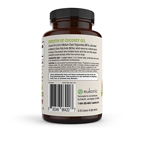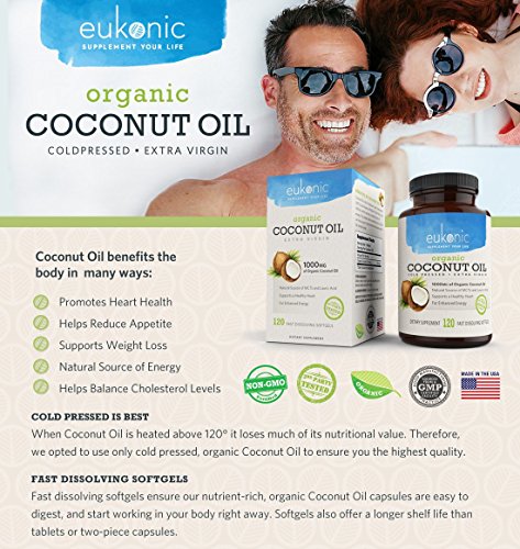-. Title : Organic Coconut Oil Capsules Extra Virgin 1000 mg by Eukonic :: 120 Softgels :: Weight Loss :: Supports Healthy Diet :: Healthy Cholesterol Levels :: Non-GMO :: Made in USA :: 3rd Party Tested