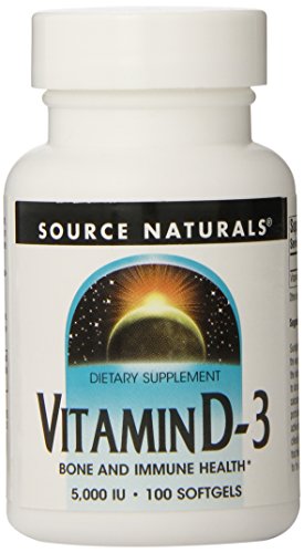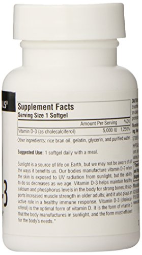 -. Binding : Health and Beauty -. Brand : Source Naturals -. EAN : 0021078023838 -. Feature : Our bodies manufacture vitamin D-3 when the skin is exposed to UV radiation from sunlight, but the ability to do so decreases as we age / Helps maintain healthy calcium and phosphorus levels in the body for strong bones / Supports increased muscle strength in older adults, and it also plays an active role in a healthy immune response / It is the form of vitamin D that the body manufactures in sunlight, and the form most efficient for the body's needs -. Label : Source Naturals -. Manufacturer : Source Naturals -. NumberOfItems : 12 -. PackageQuantity : 12 -. ProductGroup : Health and Beauty -. ProductTypeName : HEALTH_PERSONAL_CARE -. Publisher : Source Naturals -. ReleaseDate : 2015-06-22 -. Studio : Source Naturals -. Title : Source Naturals Vitamin D-3 5000IU, 100 Softgels (Pack of 12) -. UPC : 021078023838