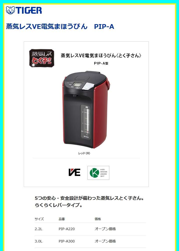 ●タイガー PIP-A300R 蒸気レスVE電気まほうびん 「とく子さん」 2.91L レッド