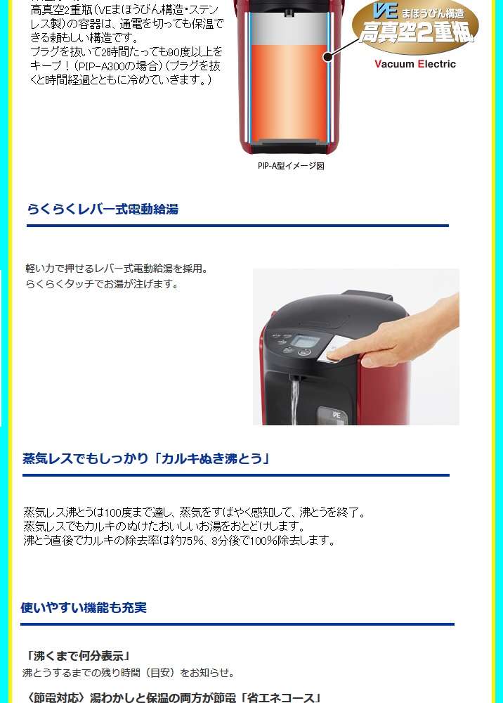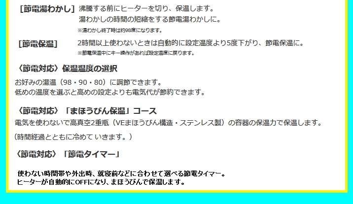 ●たっぷり沸かしてまほうびんで保温「節電VE保温」