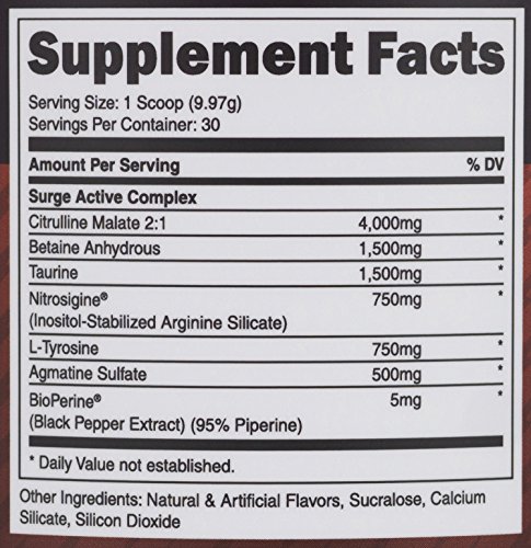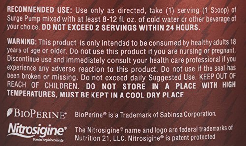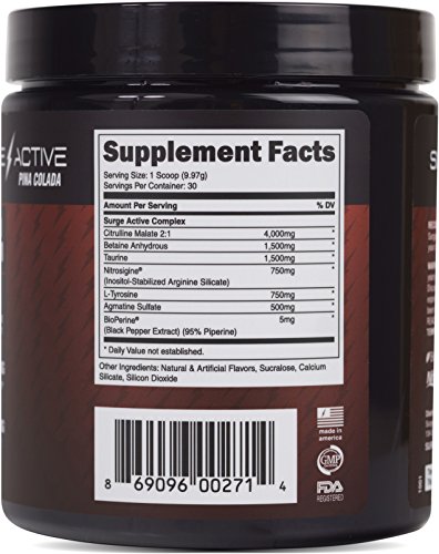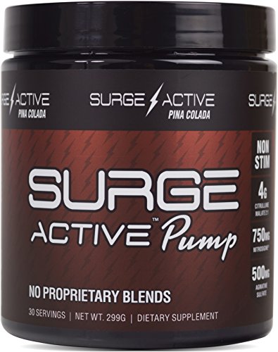 ALL THE PUMP YOU NEED WITH NO STIMULANT. YOUR WORKOUT WILL NEVER BE THE SAME, NO MATTER WHAT TIME YOU WORKOUT.Surge Active Pump contains the most ideal number of high potency ingredients per scoop, compared to any other non-stimulant pump product on the shelves today. It's formulated with four grams of citrulline malate, 750mg of Nitrosigine and 500mg of Agmatine Sulfate that deliver a powerful pump to your muscles and allows for more blood flow and vascularity. With multiple pump ingredients dosed to studied amount, you will get those skin splitting pumps that everyone is chasing in the gym. The Surge Active Pump is perfect for individuals that do not like stimulants, that workout in the evenings, or someone looking to add pump to their current pre-workout.
