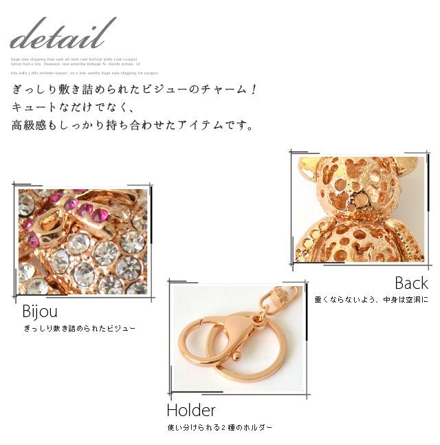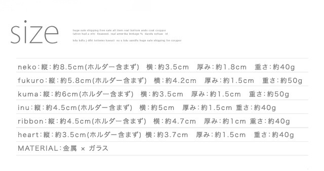 サイズ:kuma:約6cm×3.5cm×1.5cm 重量:50ginu:約4.5cm×5cm×1.5cm 重量:40gheart:約3.5cm×3.7cm×1.5cm 重量:40gneko:約8.5cm×3.5cm×1.8cm 重量:40gfukuro:約5.8cm×4.2cm×1.5cm 重量:50gribbon:約4.5cm×4.7cm×1cm 重量:40g(※全てキーホルダー部分は含まず)素材:ガラス・金属