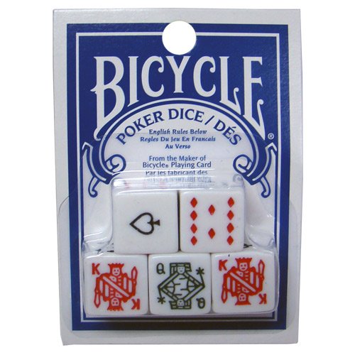 Studio : Brybelly.com Publisher : Brybelly.com Binding : Misc. Product Description These Bicycle branded poker dice combine the fun and excitement of Poker and Yahtzee. Poker dice are dice which, instead of having number pips, have representations of playing cards upon them. Poker dice have six sides, one each of an Ace, King, Queen, Jack, ten and nine, and are used to form a poker hand.