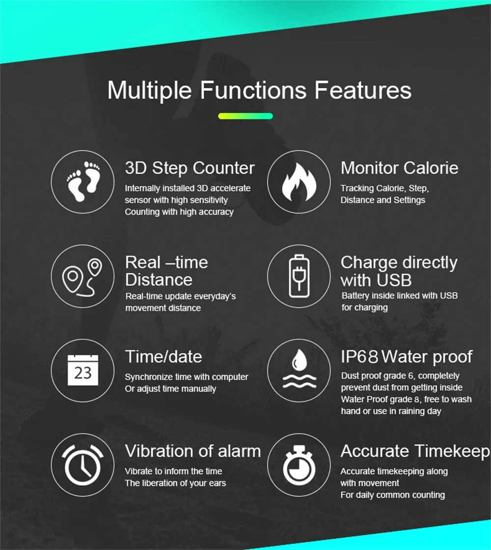 Function:Passometer,Fitness Tracker,Sleep Tracker,Message Reminder,Call Reminder,Answer Call,24 hour instruction,Alarm Clock,Heart Rate Tracker,Calendar