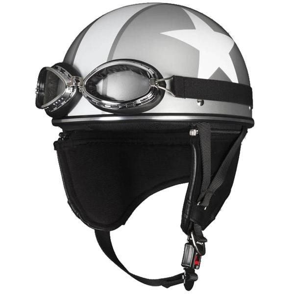 | 125cc以下のオートバイ用ハーフ型ヘルメットです。昔の映画に出てくるようなヴィンテージ風のデザインがオシャレ☆ゴーグル&イヤーカバー付きで、走行中の風から目と耳をガードしてくれます。あごひもにはワンタッチホルダーを採用!! |