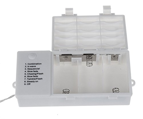 - • Battery powered string light with 9 Lighting Modes: 1. Combination 2. Steady on 3. In Waves 4. Sequential 5. Chasing/Flash 6.Slo Glo 7. Step On 8. Slow Fade 9. On/Off