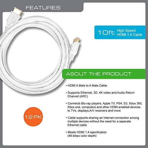 QualGear QG-CBL-HD14-WHT-12PK High Speed HDMI 1.4 Cable with Ethernet, 3D, 10' White, 12 Pack