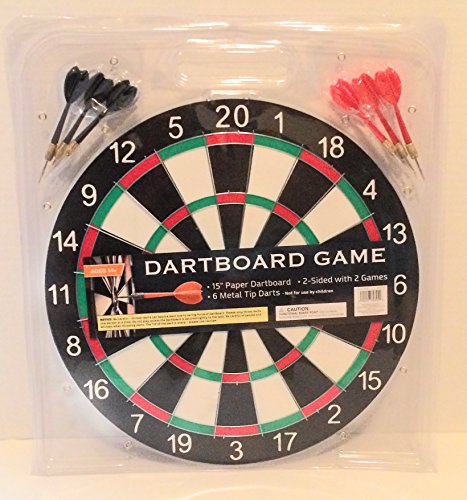 -. Feature : Two sided dartboard game, Six metal tip darts, 15" paper dartboard
