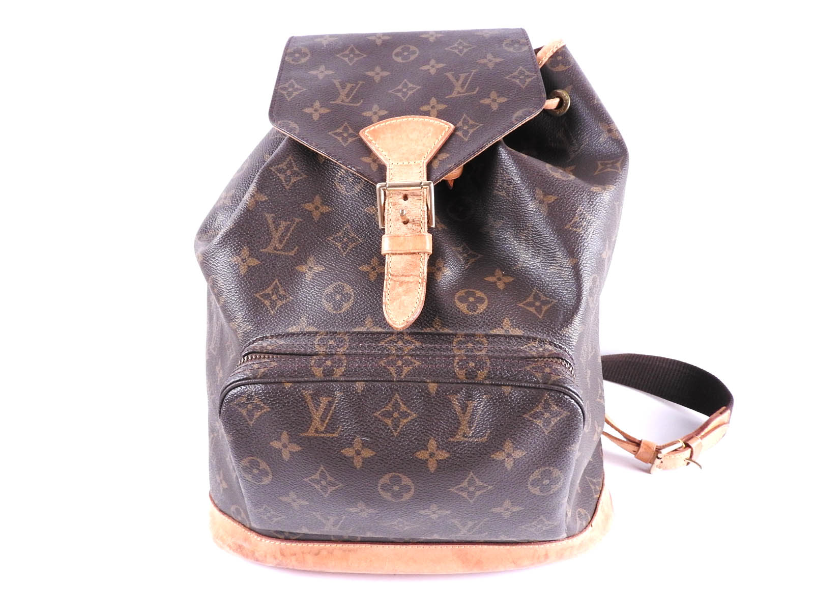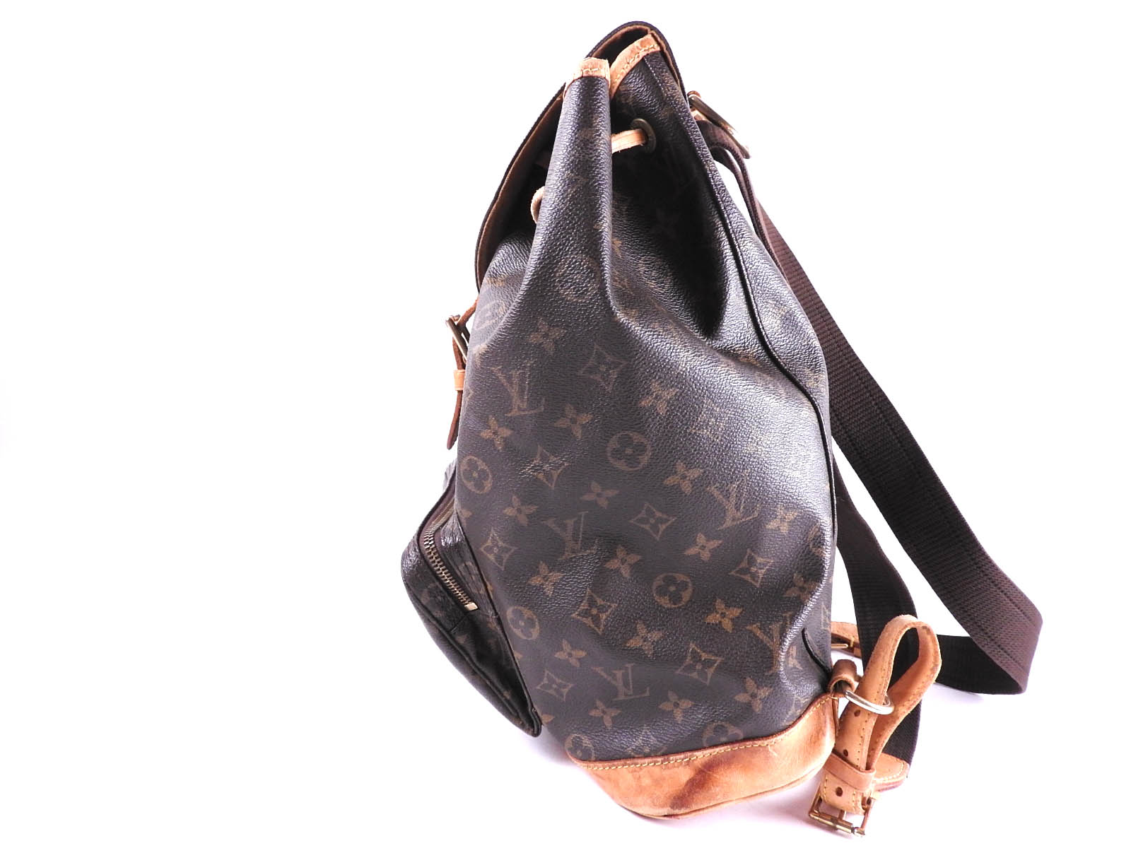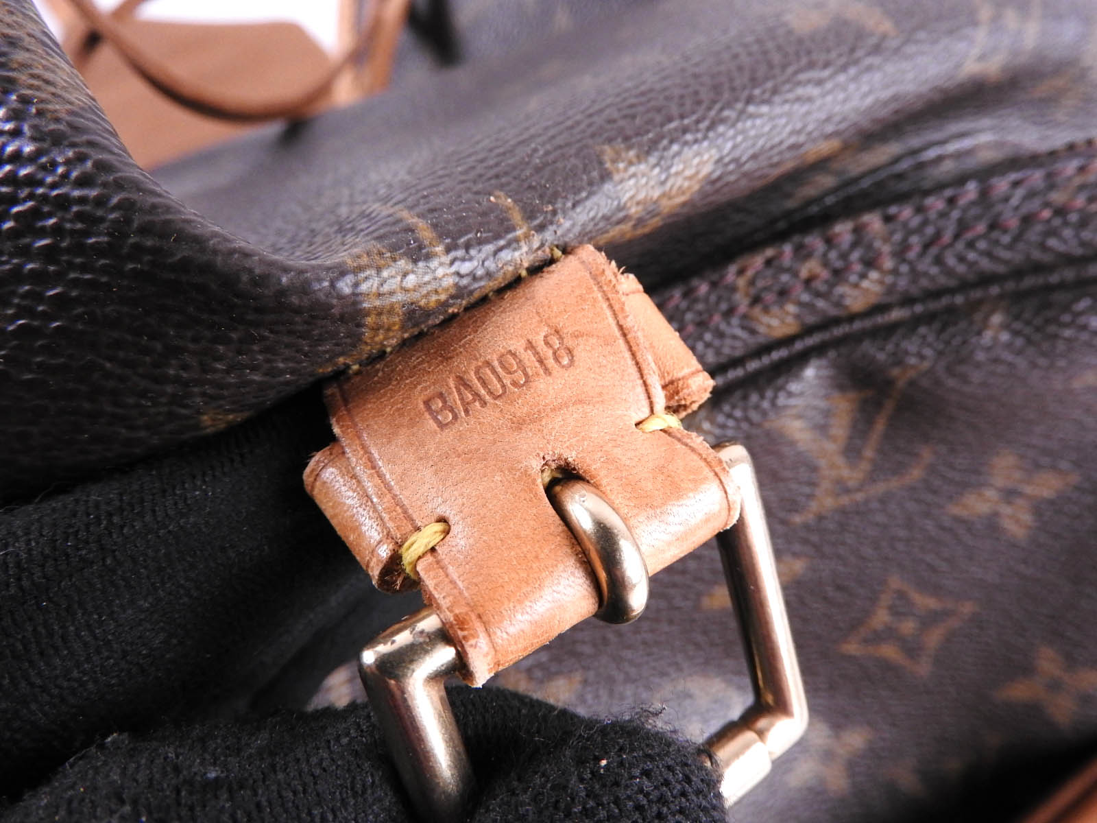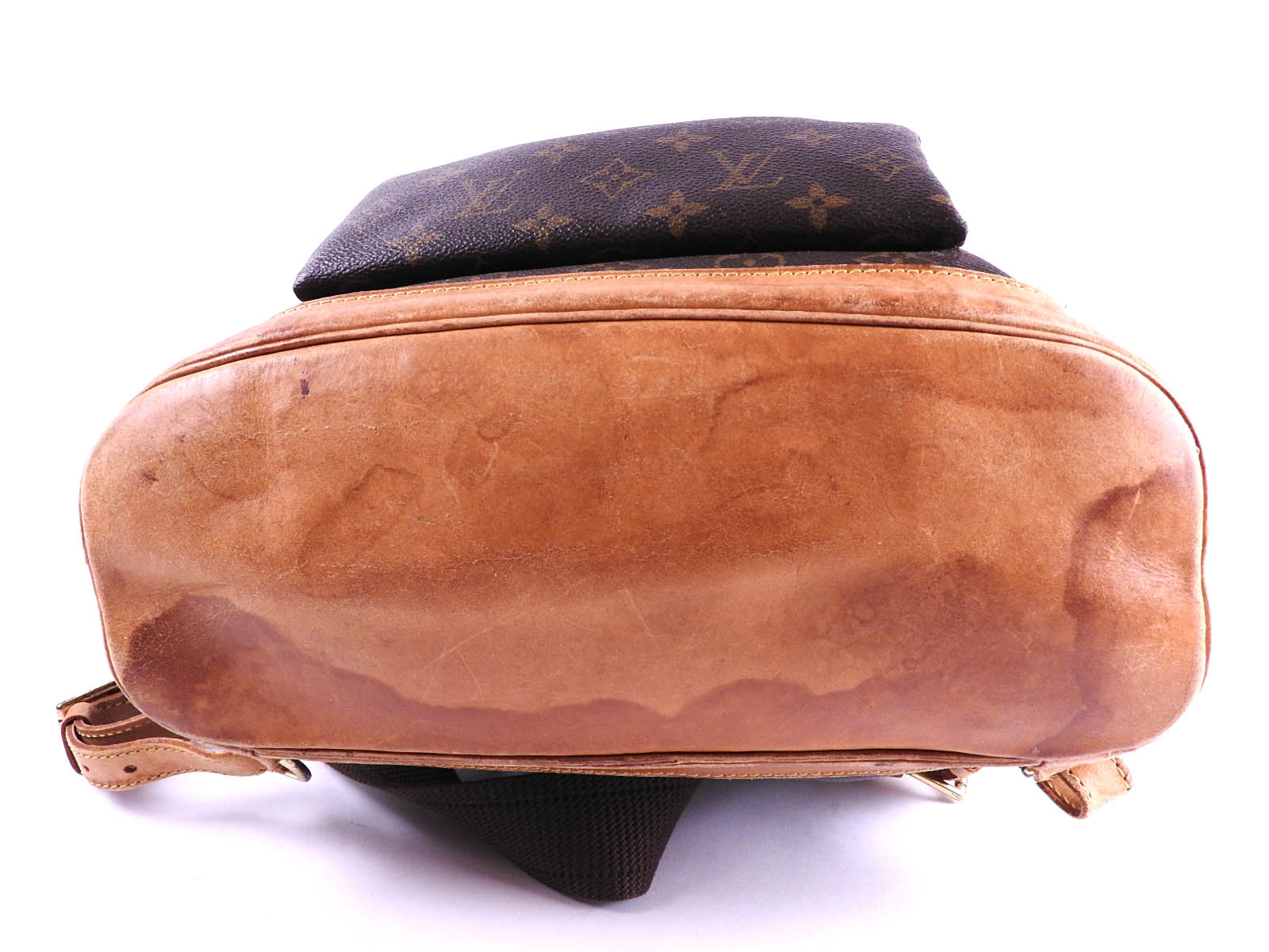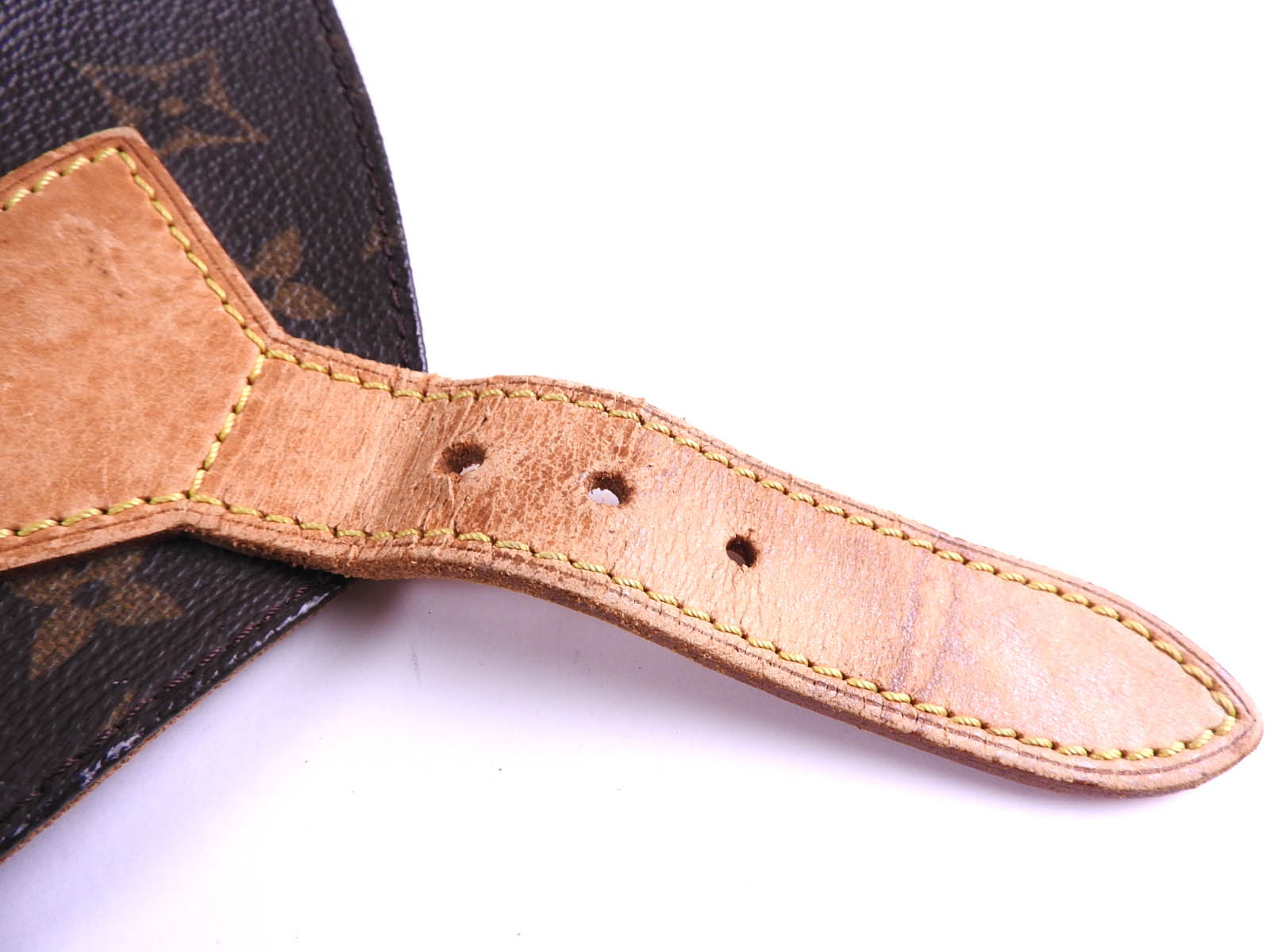 Monogram: Used feeling. Some stains and fading. Leather: Fairly used feeling. Tanned. Scratches, stains, wrinkles and abrasions. |