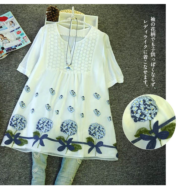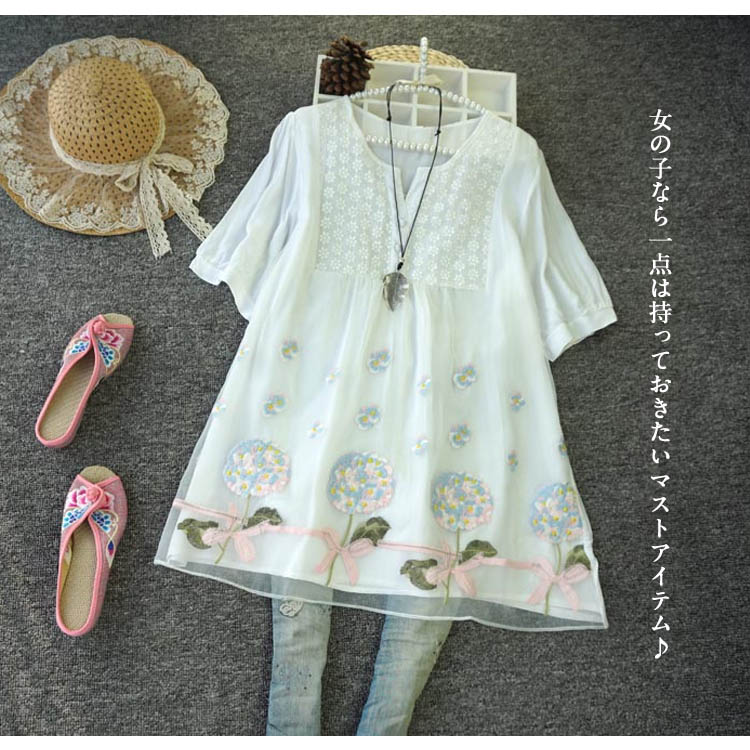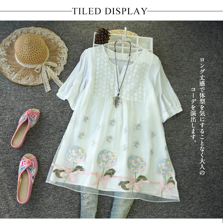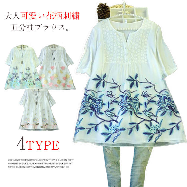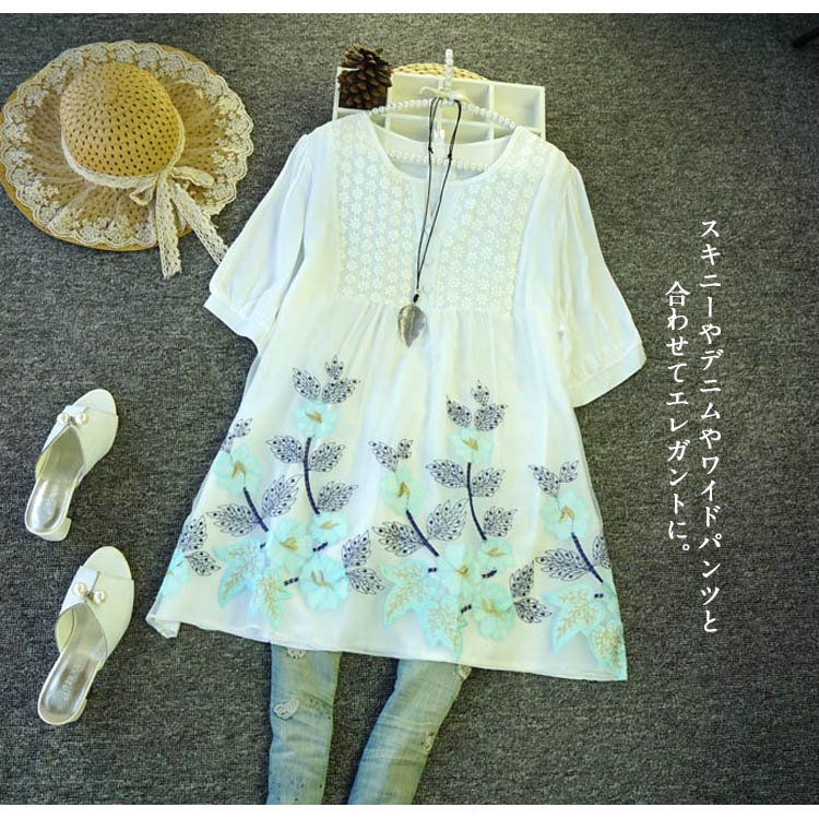 | 大人可愛い花柄刺繍五分袖ブラウス。ロング丈感で体型を気にすることなく大人のコーデを演出します。袖の花柄でも子供っぽくならず、レディライクに着こなせます。スキニーやデニムやワイドパンツと合わせてエレガントに。女の子なら一点は持っておきたいマストアイテム♪ | |