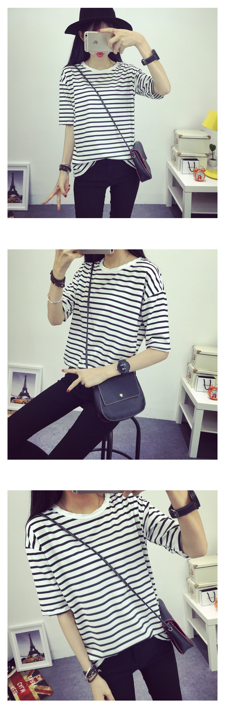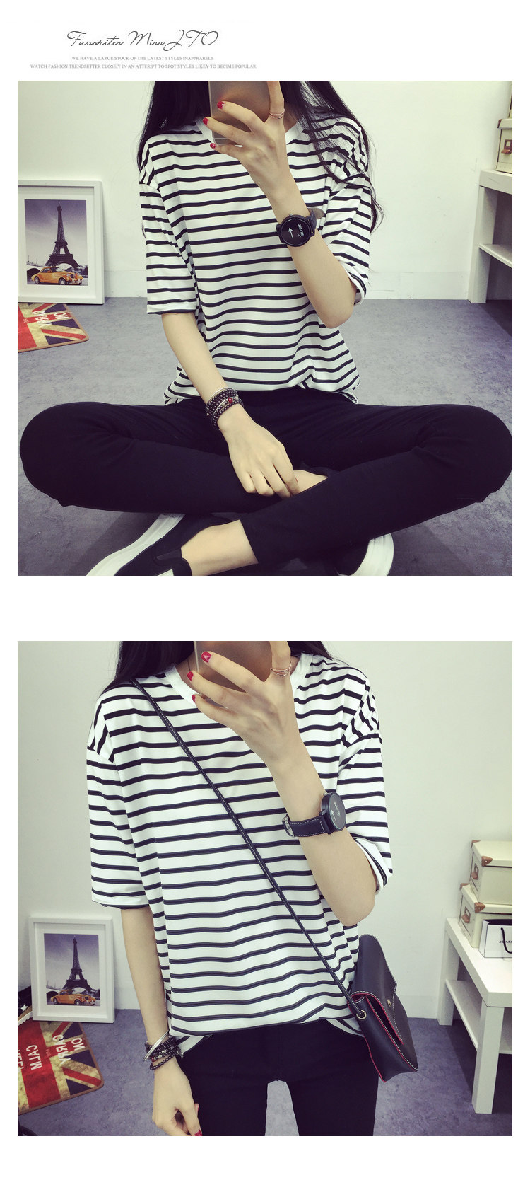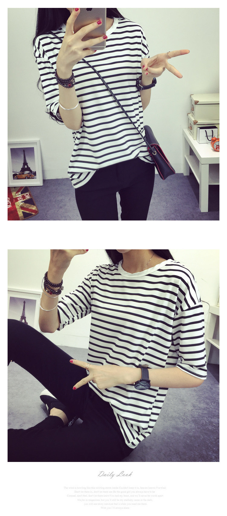 春夏装韩版休闲百搭宽松短袖棉料条纹T恤女卡通半袖体恤打底衫潮