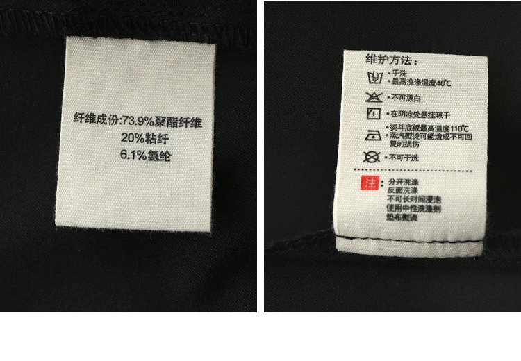 洗涤标准:不可浸泡不可漂白悬挂晾干40℃以下手洗110℃以下反面熨烫不可干洗