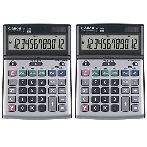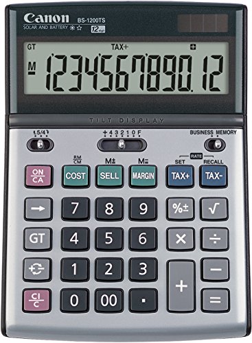The Canon BS-1200TS desktop calculator features an extra large 12-digit display, an adjustable tilt LCD screen and a high quality shell casing. Equipped with a range of Business and Tax functions, the BS-1200TS enables you to switch decimal places, perform automatic rounding and perform Cost-Sell-Margin and tax calculations with ease. A classic metallic design and solar and battery sources make the BS-1200TS perfect for calculations in any professional business setting.