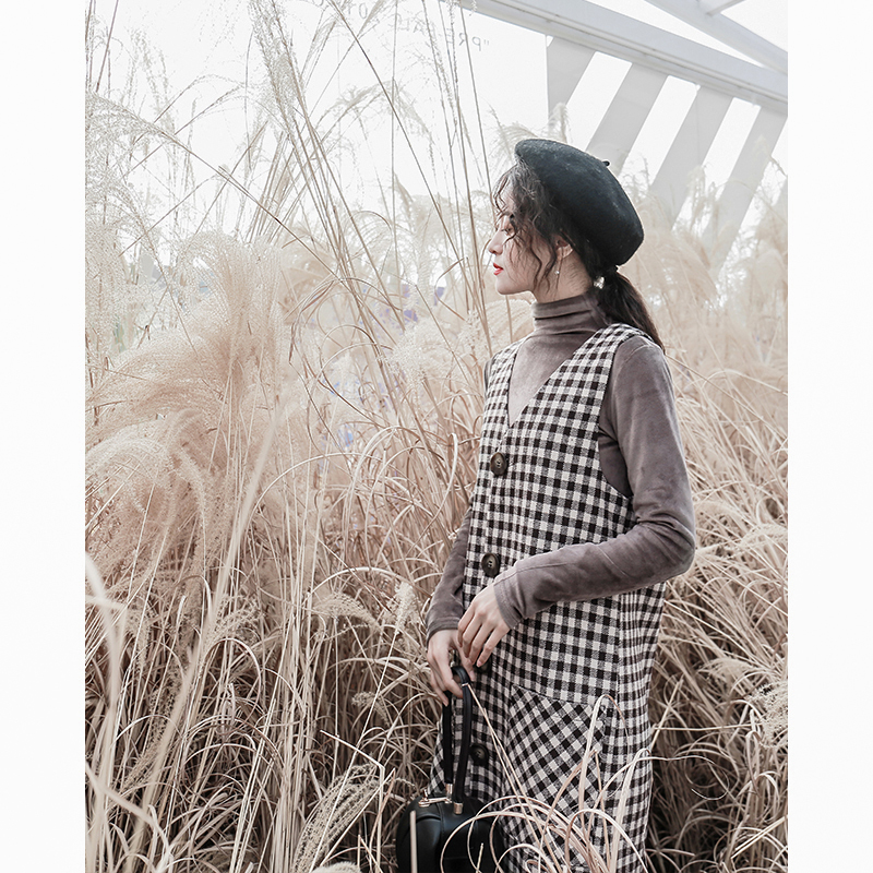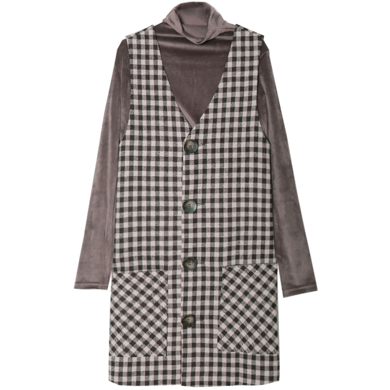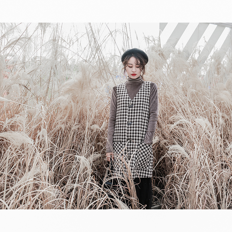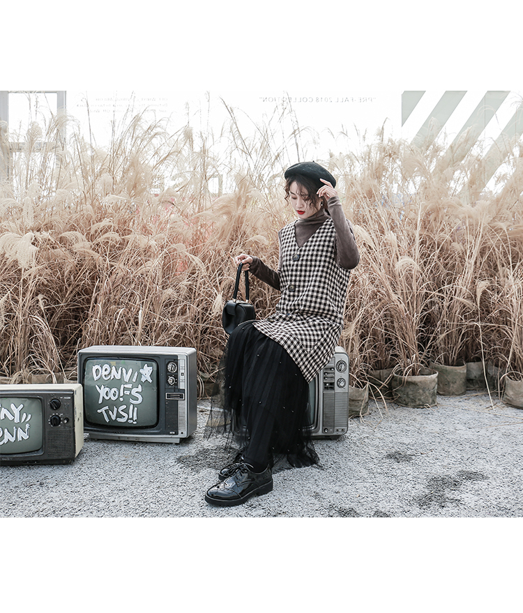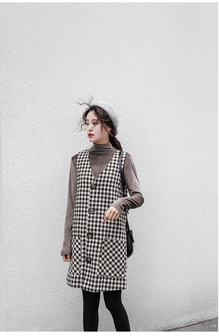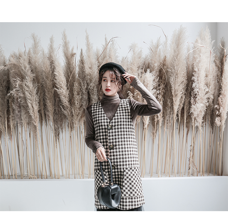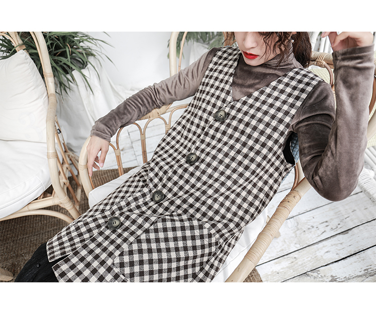 釦が今年らしく、ワンピースとしてだけではなくロングベストとしても着ていただける技ありデザインの一着。