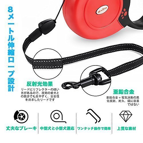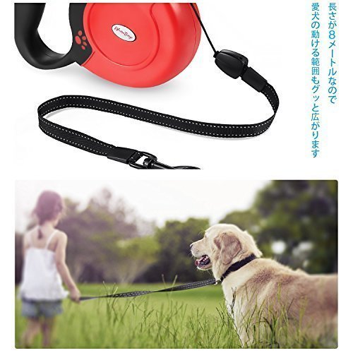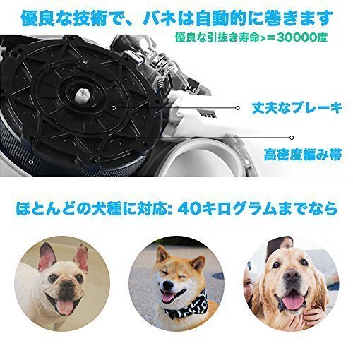 - 巻き取り式のドッグリードは、毎日のお散歩中、愛犬を遠くからコントロールできるよう設計されています。最長8メートルまで伸ばせるので、限度範囲の中であっても、愛犬を安全な距離を保ちながら自由に歩き回らせてあげられます。
