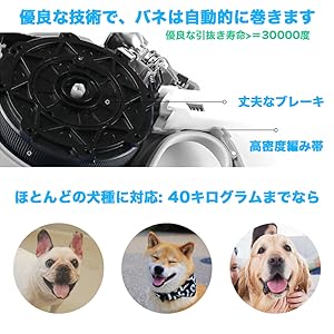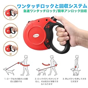 - また片手だけでブレーキをかけたり巻き戻せるメカニズムにより、一度お好みの距離に調節してからブレーキボタンを押すだけで、長さをそのまま固定できます。もし愛犬が遠くへ行き過ぎてしまったら、少し近づいてコードを巻き取り、またロックするだけでバッチリ!