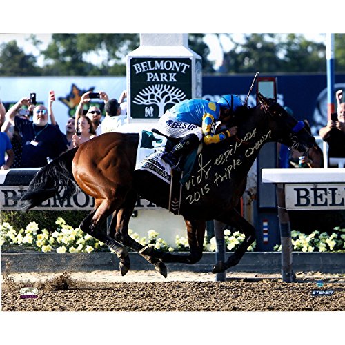 Victor Espinoza Signed American Pharoah Finish Line Celebration 2015 Belmont Stakes 16x20 Photo w/ 2015 Triple CrownInsc.(Signed in Silver)