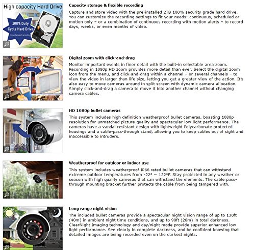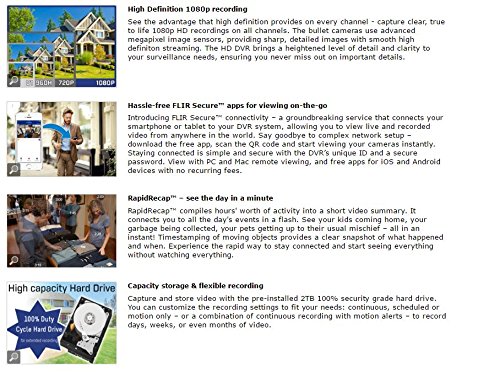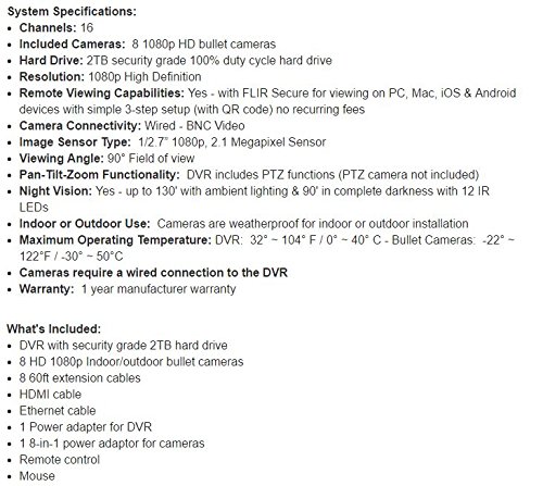 -. Feature : 8 1080p HD Weather Proof Outdoor/Indoor Bullet Cameras, with 130' Night Vision, Model No. LBV2531 / 16-Channel 1090p 2TB HDD, Model No. LHV21162TFS / 8 60' Extension Cables, 1 8-in-1 power adaptor, remote contrcol, mouse, HDMI cable, Ethernet cable / Remote Viewing Capabilities: with FLIR Secure for viewing on PC, Mac, iOS & Android devices with simple 3-step setup (with QR code) no recurring fees / RapidRecapTM - see the day in a minute, compiles hours' worth of activity into a short video summary