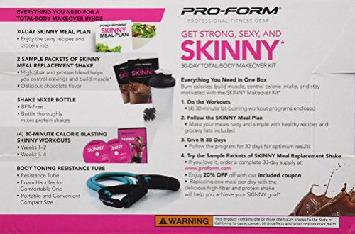 -. Binding : Health and Beauty -. Feature : Do the Workouts / Shake the Mixer bottle / 4 DVD Workouts / Body Toning Resistance Tube / Follow the Meal Plan -. IsAdultProduct : 0 -. Label : Icon Health & Fitness Inc. -. Manufacturer : Icon Health & Fitness Inc. -. ProductGroup : Health and Beauty -. ProductTypeName : HEALTH_PERSONAL_CARE -. Publisher : Icon Health & Fitness Inc. -. Studio : Icon Health & Fitness Inc. -. Title : Pro-Form Skinny 30-Day Total-Body Makeover Kit Lose Weight